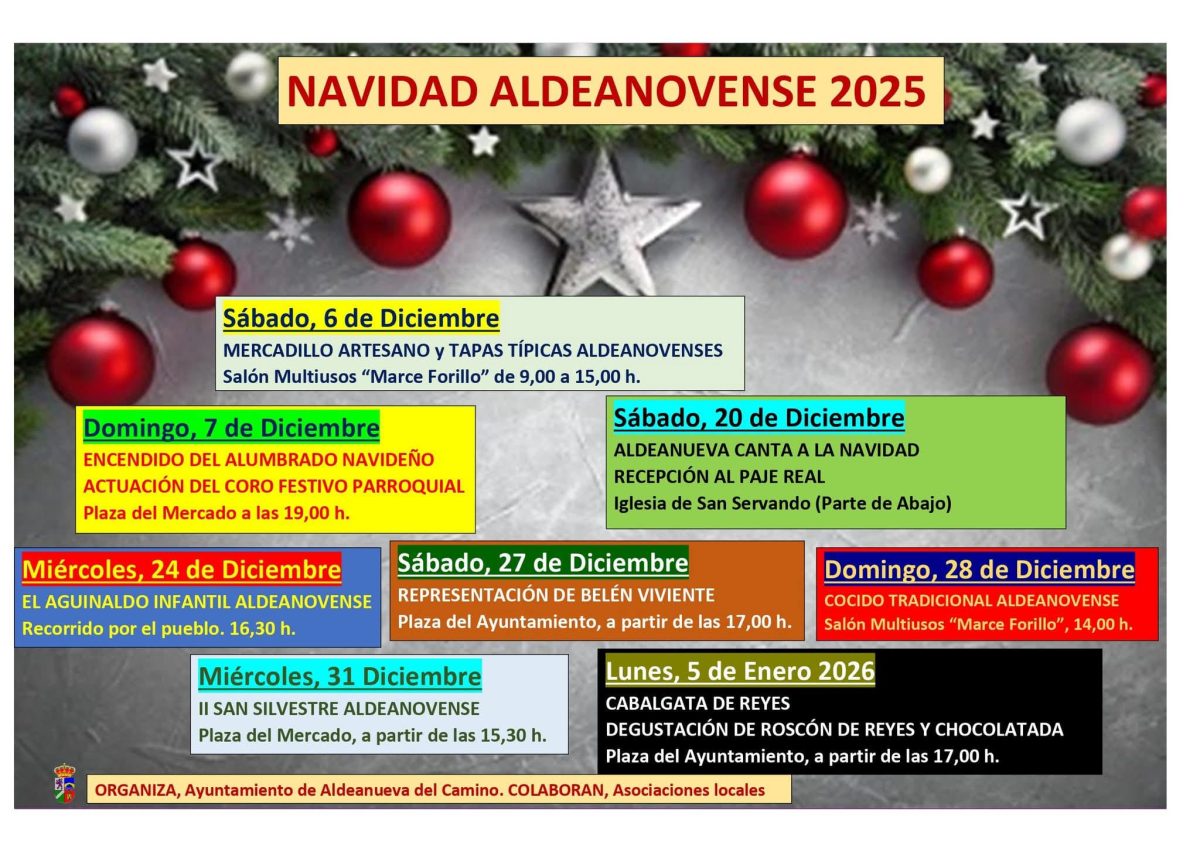 El Ayuntamiento de Aldeanueva del Camino ha presentado el programa de Navidad 2025, que incluye ocho citas festivas distribuidas entre el 6 de diciembre y el 5 de enero de 2026. Las actividades, organizadas con la colaboración de asociaciones locales, combinarán tradiciones gastronómicas, musicales y culturales propias del municipio.