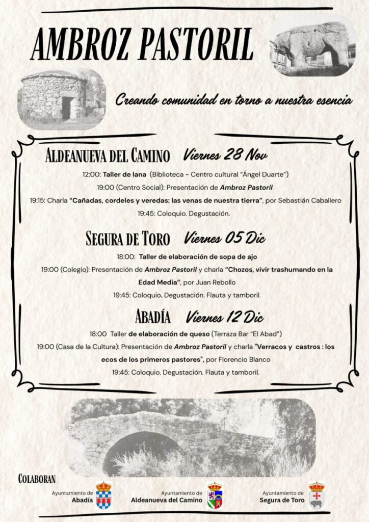 Los municipios de Aldeanueva del Camino, Segura de Toro y Abadía acogerán durante las próximas semanas el ciclo Ambroz Pastoril, una iniciativa que busca crear comunidad en torno a la esencia y tradiciones pastoriles de la comarca. El programa, organizado con la colaboración de los tres ayuntamientos, incluye presentaciones, charlas temáticas, talleres artesanales y degustaciones en cada una de las localidades.