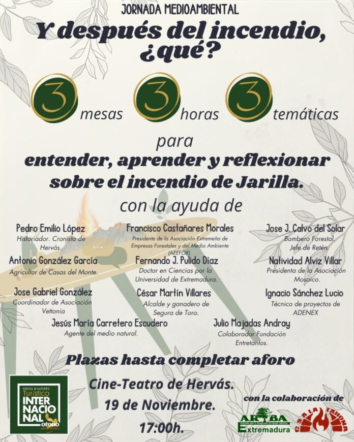 El municipio de Hervás se prepara para acoger una jornada medioambiental centrada en comprender, aprender y reflexionar sobre el incendio que afectó a Jarilla. El evento, organizado en colaboración con ARBA Extremadura y la Asociación de Municipios Forestales, tendrá lugar el martes 19 de noviembre a las 17:00 horas en el Cine-Teatro de Hervás.