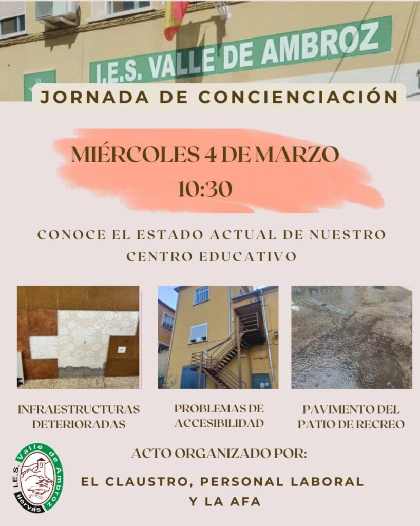 El Claustro, el Personal Laboral y la Asociación de Familias de Alumnado (AFA) del I.E.S. Valle de Ambroz de Hervás organizan una jornada de concienciación el miércoles 4 de marzo de 2026. El encuentro, programado para las 10:30, tiene como objetivo central la exposición técnica del estado de las instalaciones del centro educativo. La convocatoria surge tras registrarse deficiencias en los revestimientos, limitaciones en los accesos y un estado deficiente en el pavimento de las zonas de recreo exteriores según la información difundida por la organización.