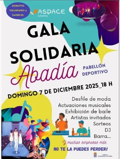 El pabellón deportivo de Abadía acogerá el próximo domingo 7 de diciembre, a partir de las 18:00 horas, una gala solidaria cuyos donativos voluntarios se destinarán a ASPACE Cáceres, la asociación de atención a personas con parálisis cerebral y discapacidades afines de la provincia.