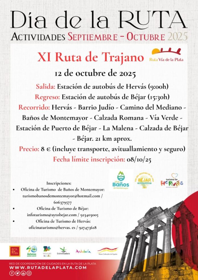 La XI Ruta de Trajano se celebrará el 12 de octubre de 2025 dentro de las actividades del Día de la Ruta programadas entre septiembre y octubre. El recorrido de aproximadamente 21 kilómetros comenzará en la estación de autobús de Hervás a las 9:00 horas y finalizará en la estación de autobús de Béjar a las 15:30 horas.