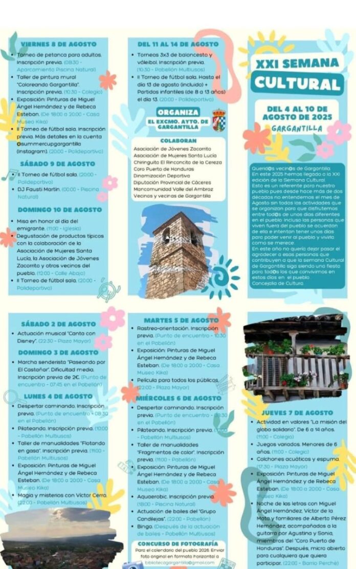 El Ayuntamiento de Gargantilla organiza la XXI Semana Cultural del 4 al 10 de agosto de 2025 con la colaboración de asociaciones locales y entidades de la Mancomunidad del Valle del Ambroz. La programación incluye actividades deportivas, culturales y de ocio para todas las edades.