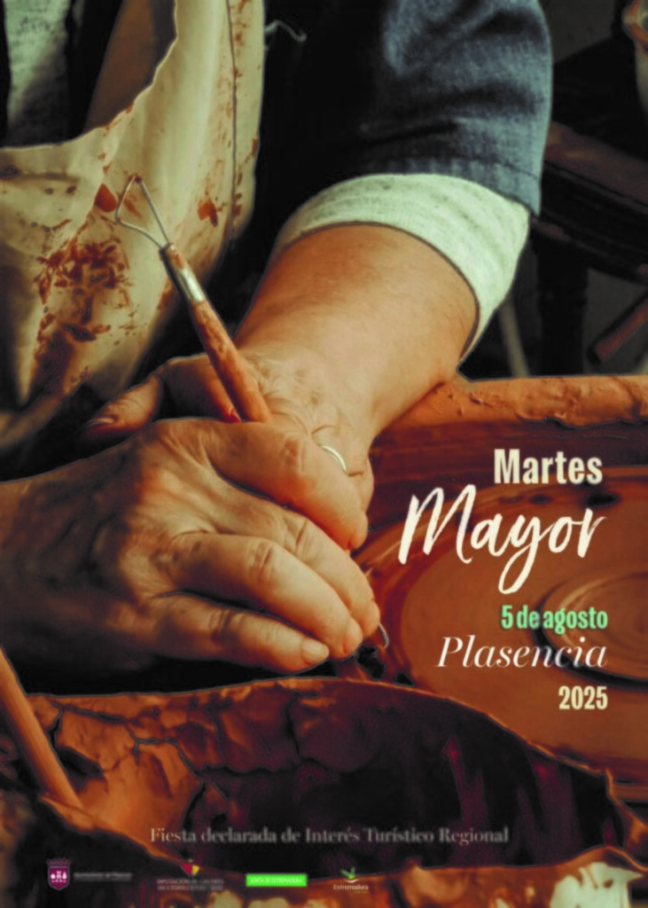 El cartel de esta edición ha sido diseñado por Rocío Vicente Corral, de la Diputación Provincial de Cáceres, y rinde homenaje a los artesanos, protagonistas esenciales de esta cita cultural. La imagen elegida rompe con la estética habitual de años anteriores, apostando por una composición sobria pero cargada de simbolismo: unas manos moldeando barro, en representación del saber transmitido, la dedicación silenciosa y el orgullo por el trabajo bien hecho.
